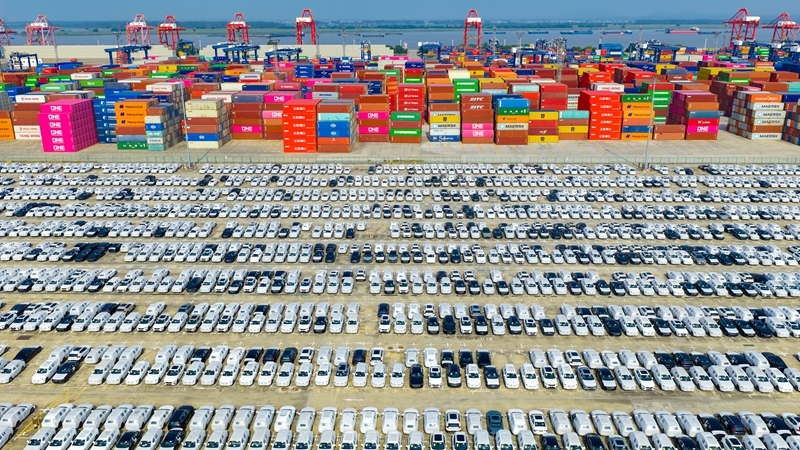 2025年10月4日在江苏省港口集团南京港龙潭港区拍摄的准备装船出口的汽车(无人机照片)。新华社发(杨素平 摄)